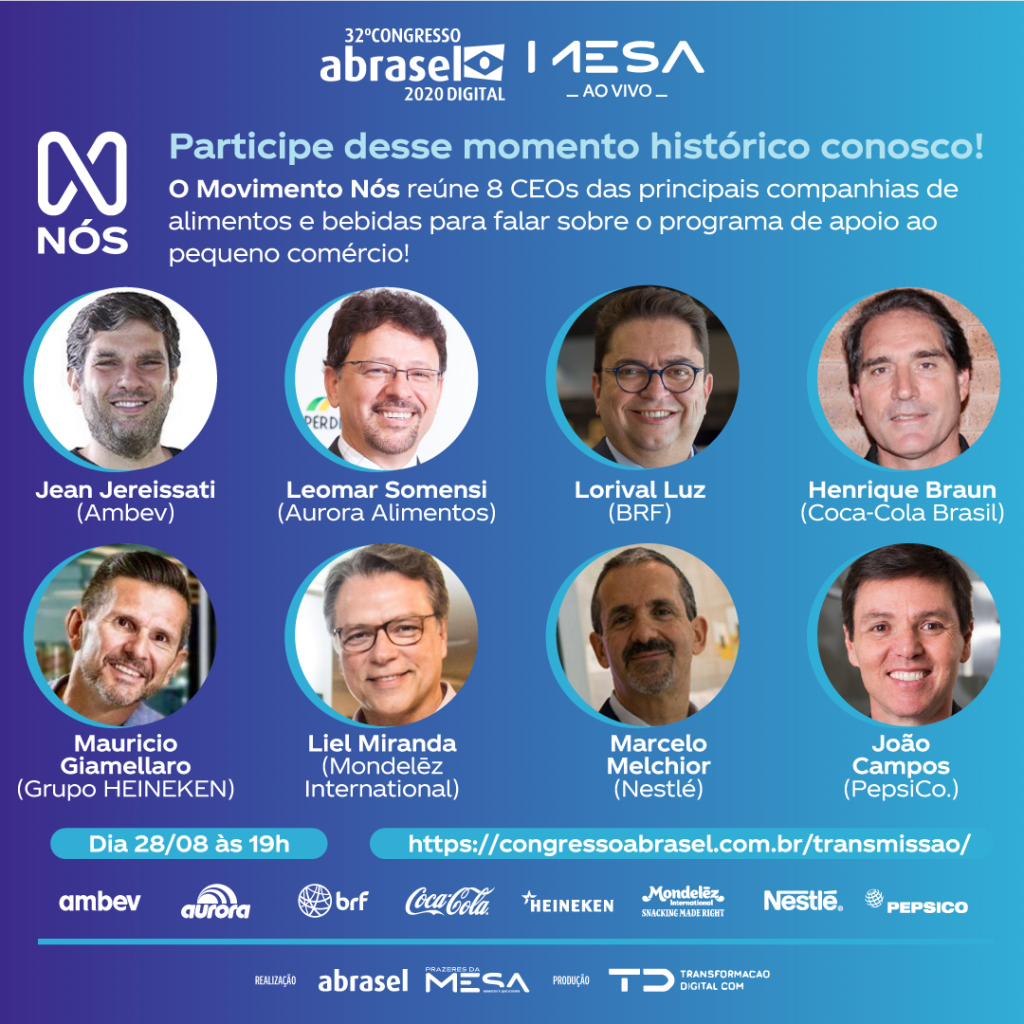 Para encerrar o 32º Congresso Abrasel com chave de ouro, o Movimento Nós que reúne 8 CEOs das principais companhias de bebidas e alimentos para falar sobre o programa de apoio ao pequeno comércio. Não perca! Na sexta-feira dia 28 às 19h.